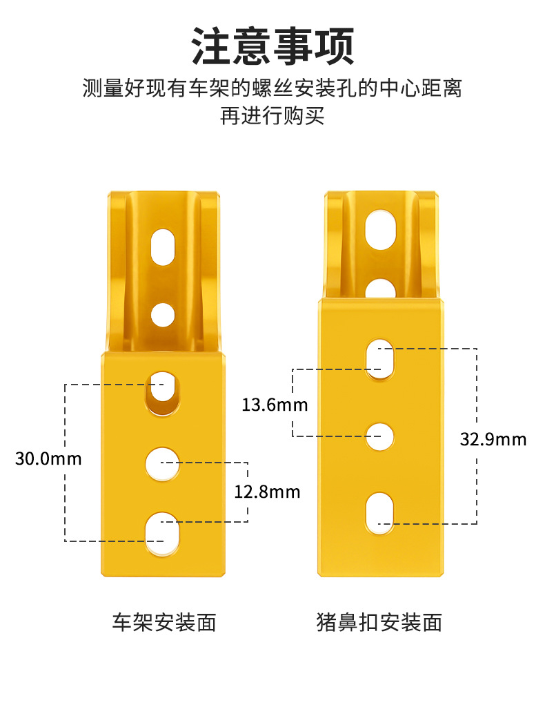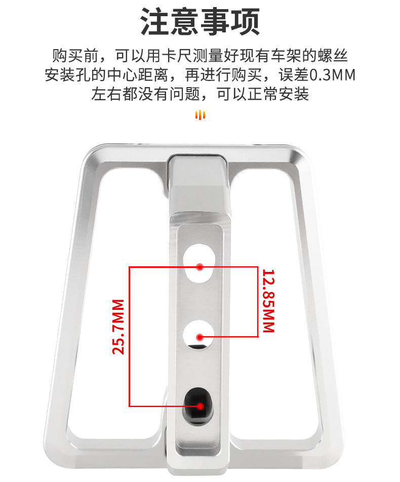 适用:适用于小布,大行自行车前车包安装架 安装孔距离:3孔安装孔距12.85MM,2孔安装孔距25.7MM.