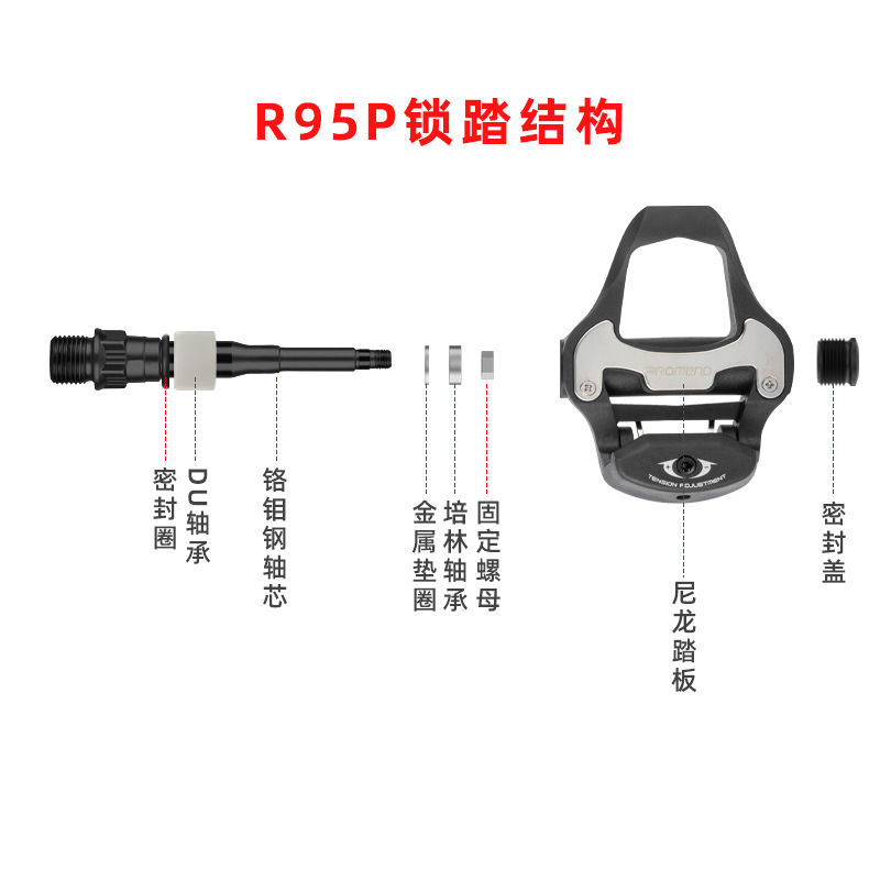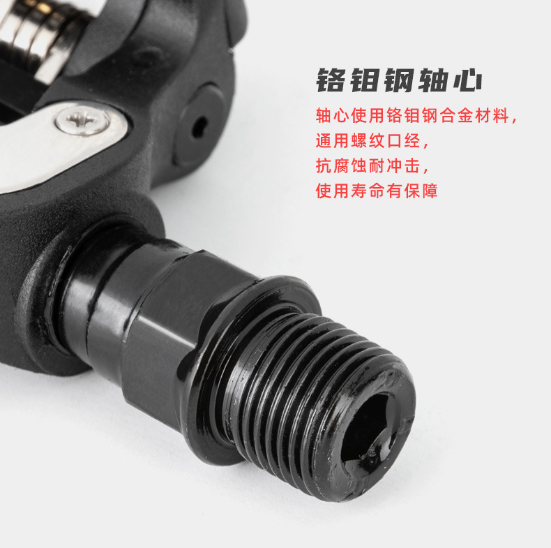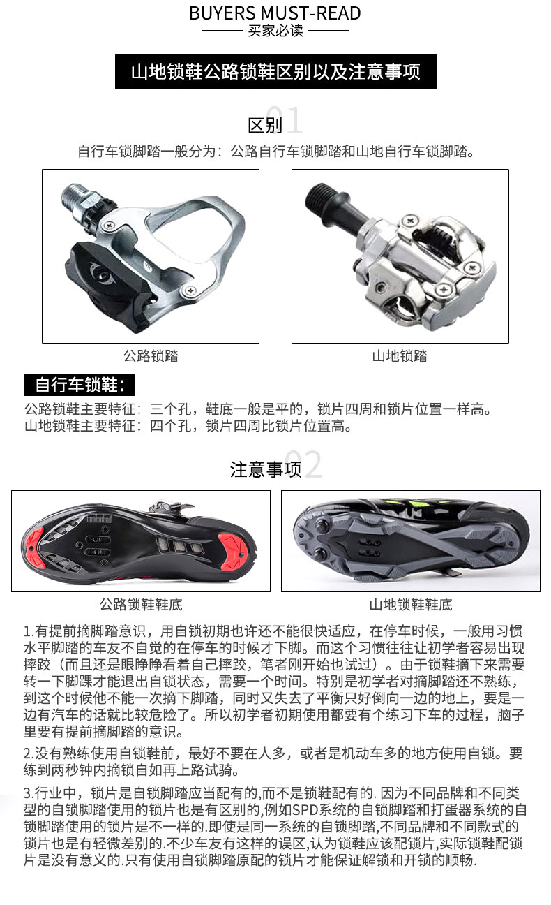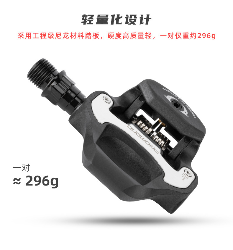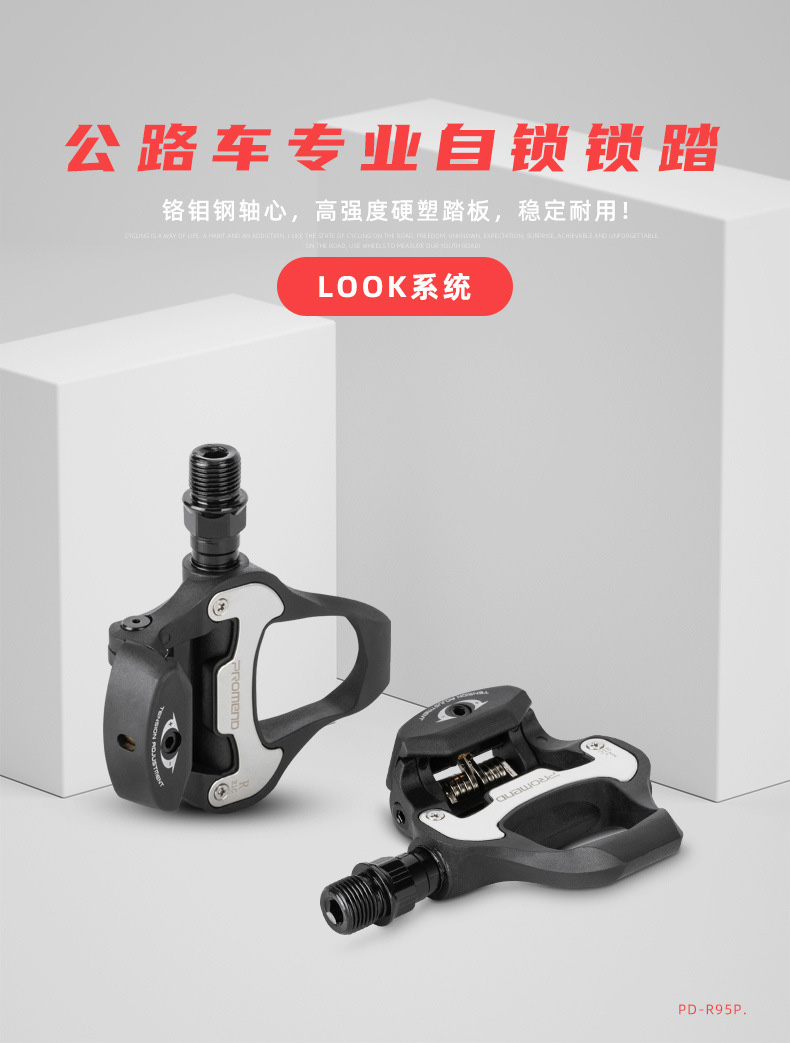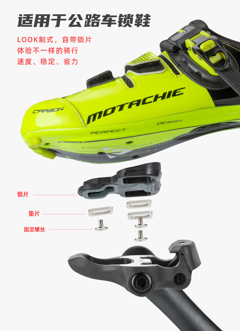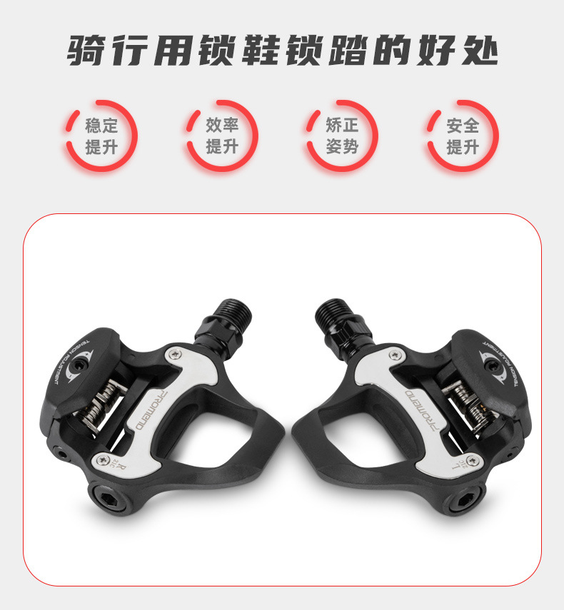 特点:公路锁踏可以帮助车手提高踏频速度,如果在不使用锁踏情况下,踏频速度达到120以上时,就会有鞋与脚踏脱离的危险。所以使用锁踏可以提升你的踏频。加上锁鞋是固定在锁踏上的,可以矫正骑行姿势,不用担心骑行姿势不对,造成身体上的劳损。
