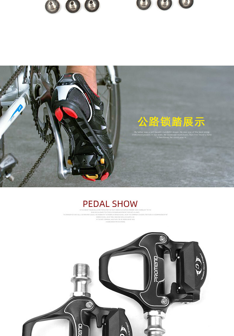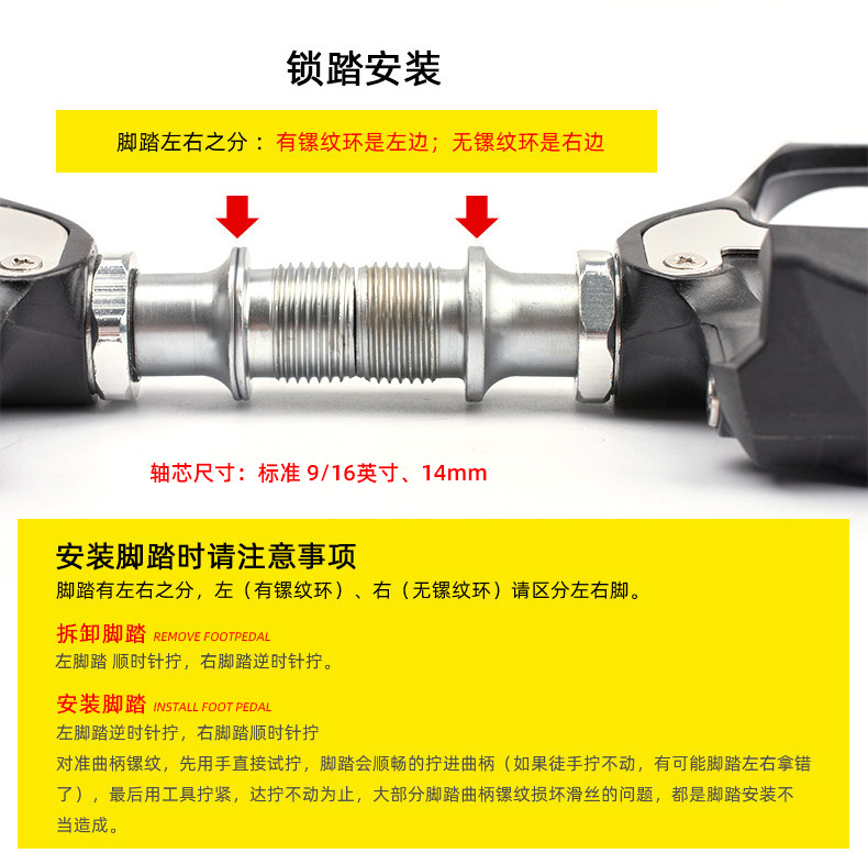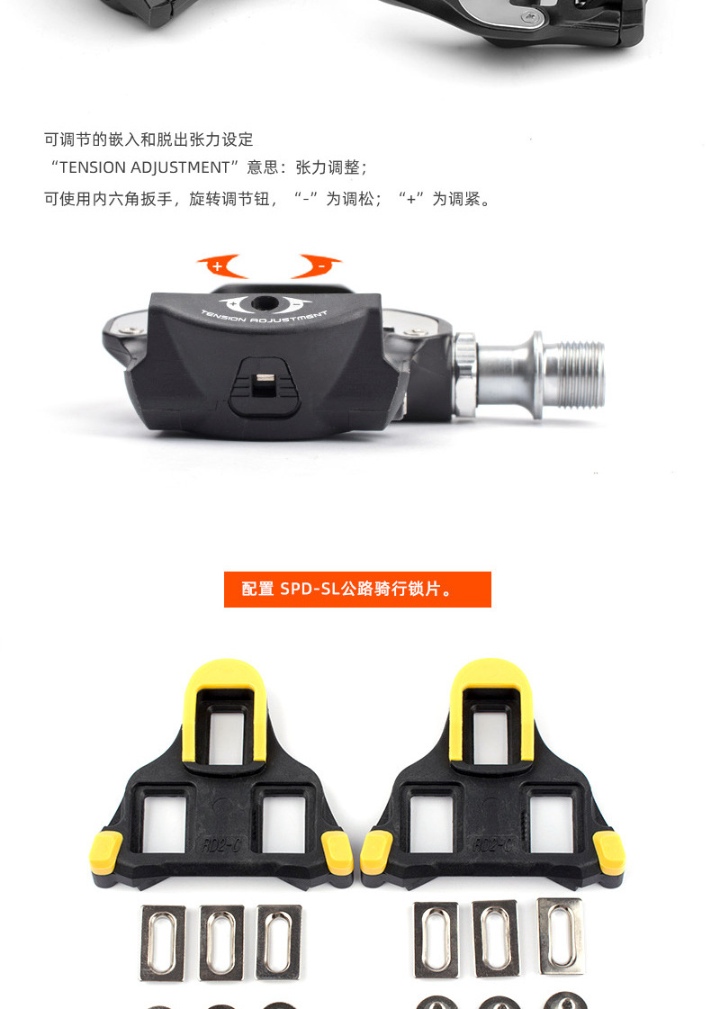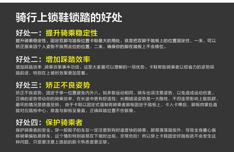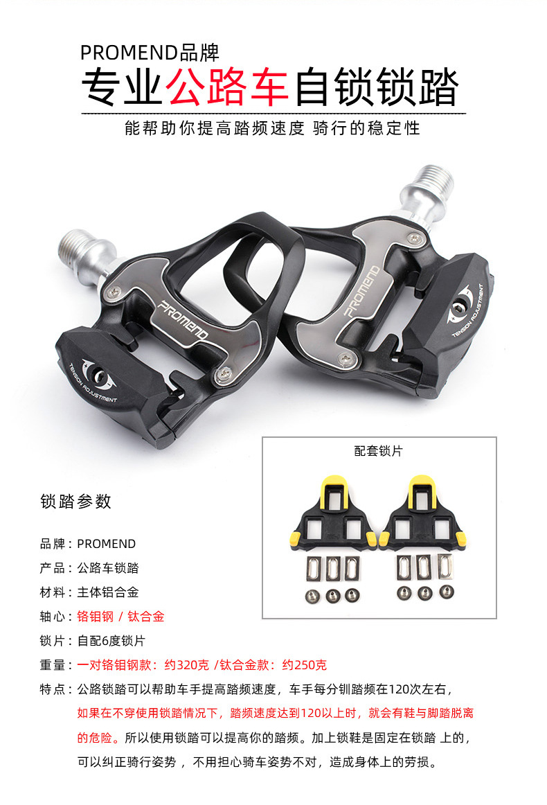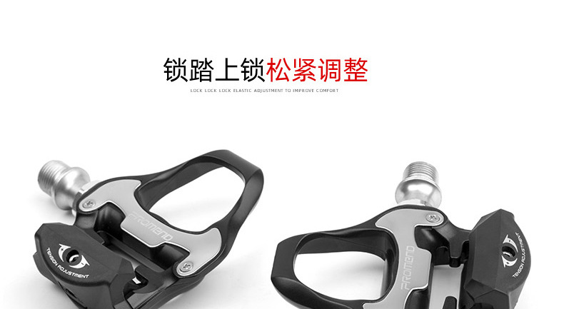 特点:公路锁踏可以帮助车手提高踏频速度,如果在不使用锁踏情况下,踏频速度达到以上时,就会有鞋与脚踏脱离的危险。所以使用锁踏可以提升你的踏频。加上锁鞋是固定在锁踏上的,可以矫正骑行姿势,不用担心骑行姿势不对,造成身体上的劳损。
